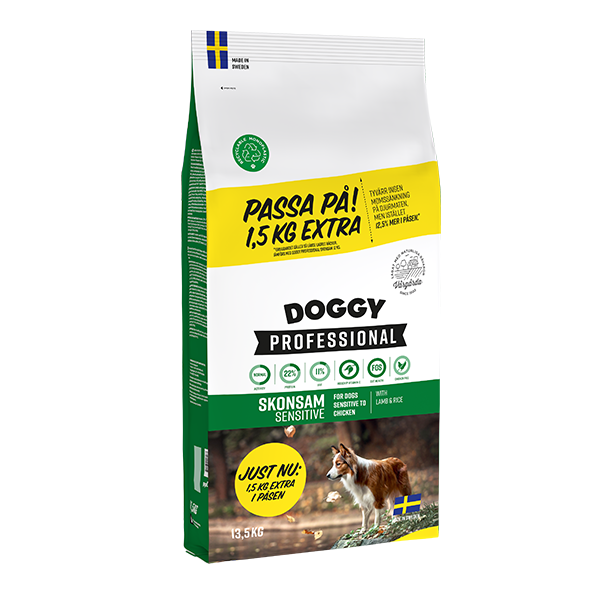 Sänkt matmoms på livsmedel, men tyvärr ingen momssänkning på djurmaten. Detta vill vi göra något åt och lanserar Doggy Professional Skonsam 13,5kg – en kampanjpåse* med 1,5kg extra mat i påsen utan att höja priset.